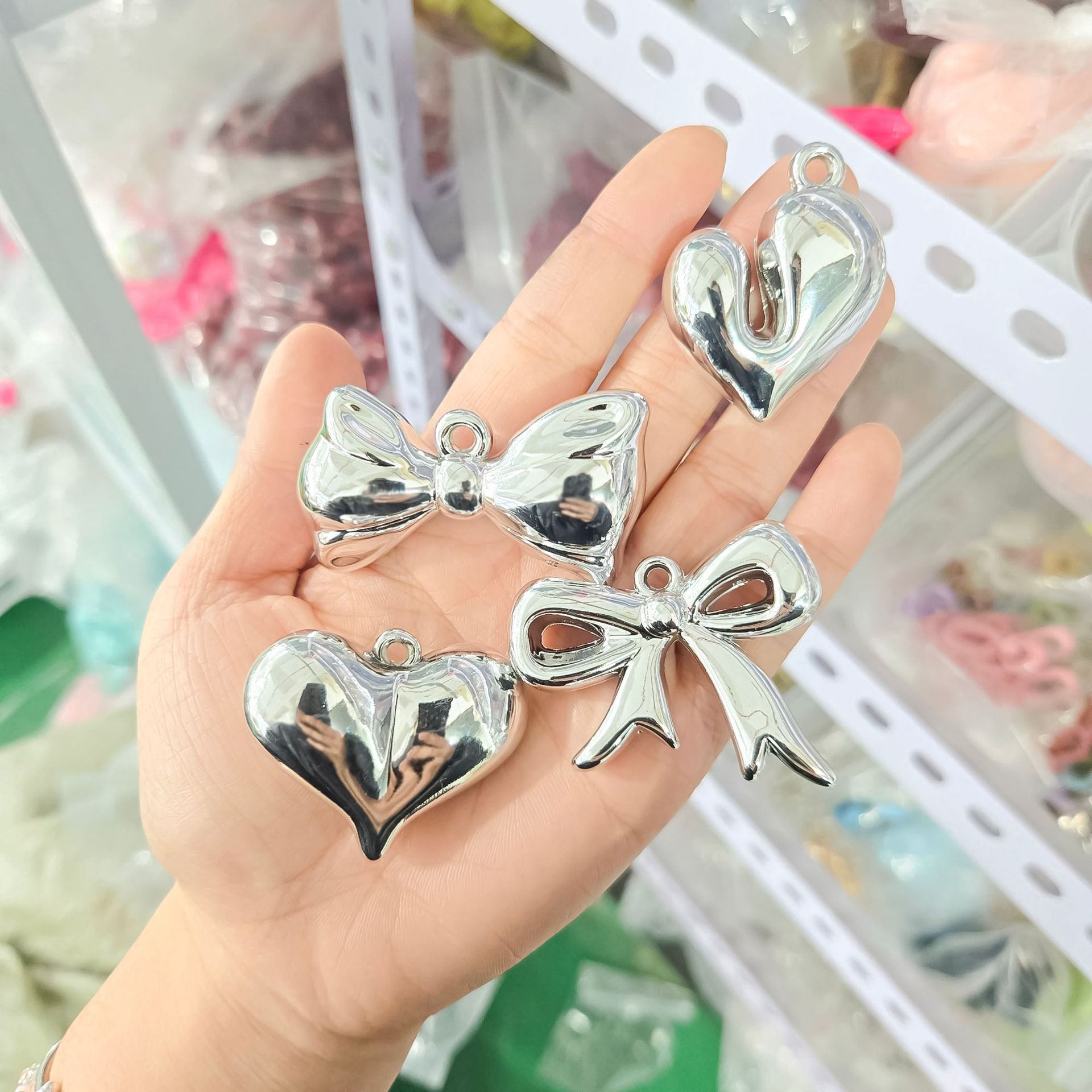 多规格银色蝴蝶结爱心DIY挂饰配饰UV镀光面立体带圈桃心吊坠配件