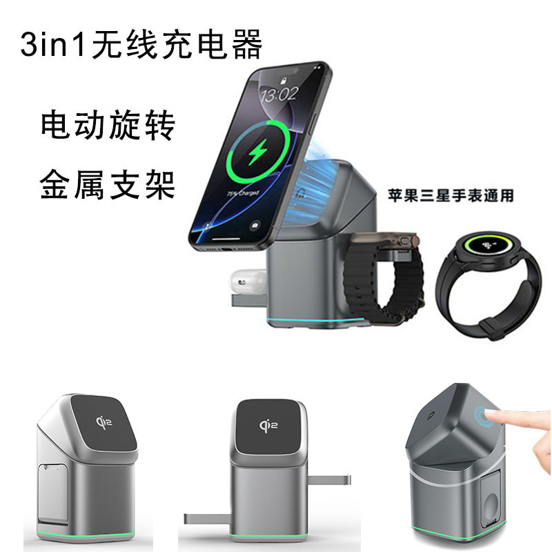 跨境QI2三合一无线充电器电动旋转适用苹果三星磁吸快充Qi2认证KC