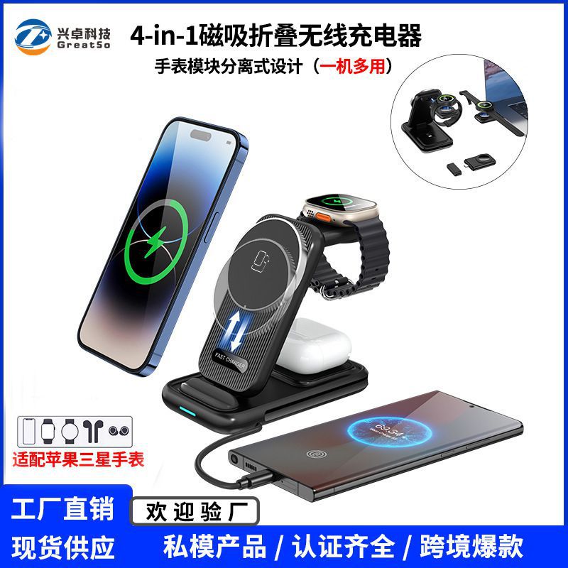 新品 无线充电器磁吸折叠支架四合一适用苹果三星手表耳机 KC标准