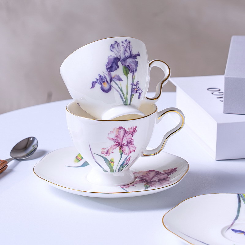 法式田园风高骨瓷下午茶陶瓷杯碟 鸢尾花咖啡杯套装金边高脚杯碟