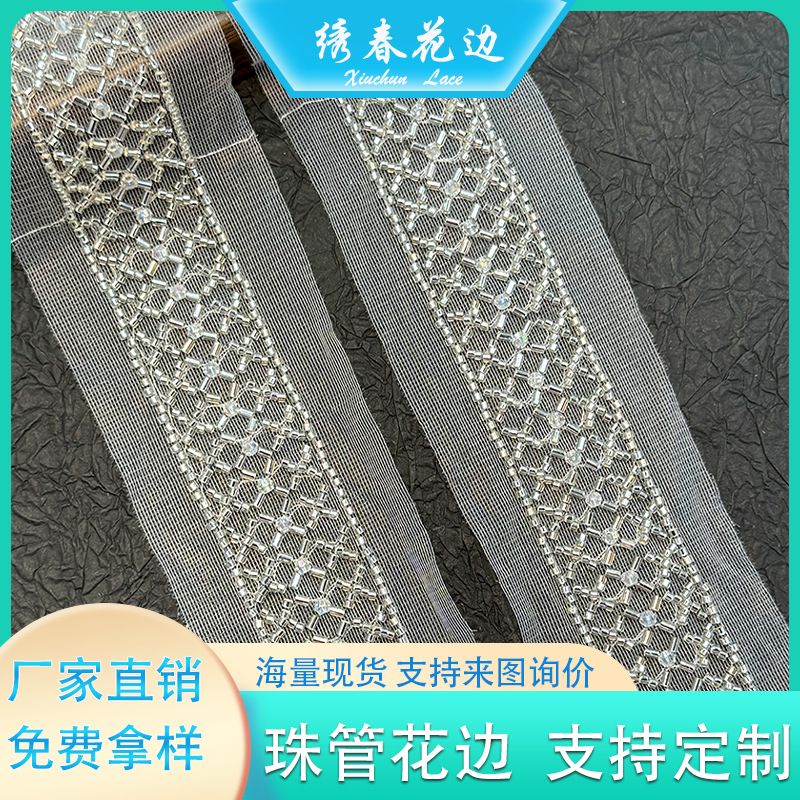 小香风织带花边 机绣网纱钉珠水钻 DIY领口袖口装饰珠管珍珠花边