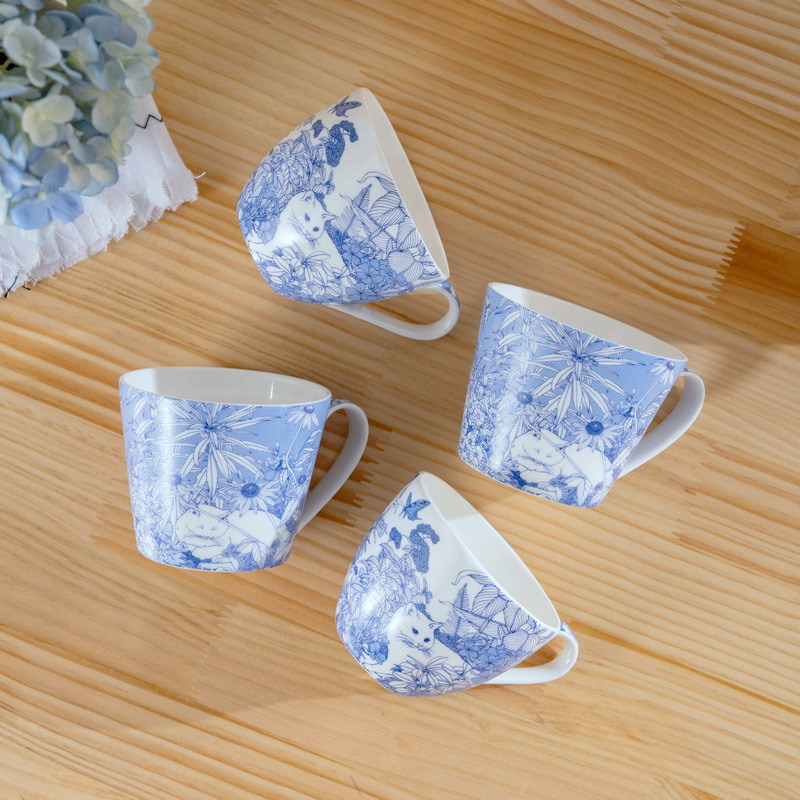 小清新田园风花瓣形陶瓷杯 可爱青花猫咪高骨瓷水杯马克杯四件套