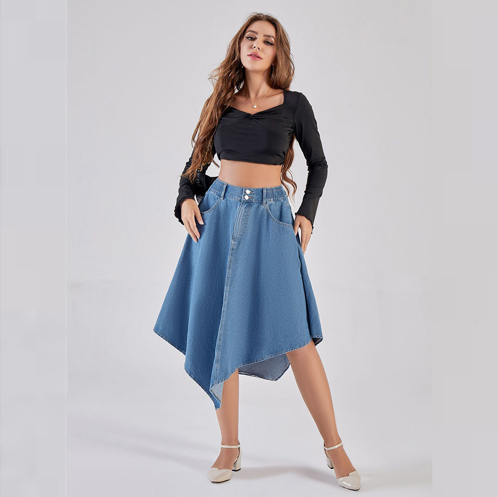 欧美女式牛仔半身裙 亚马逊跨境女装街头潮流松紧腰不规则牛仔裙