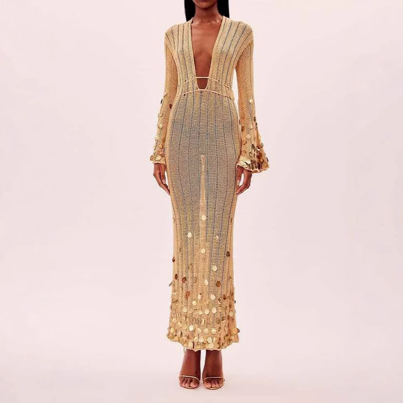 2025年春夏跨境外贸新款气质V领亮片喇叭袖针织长裙