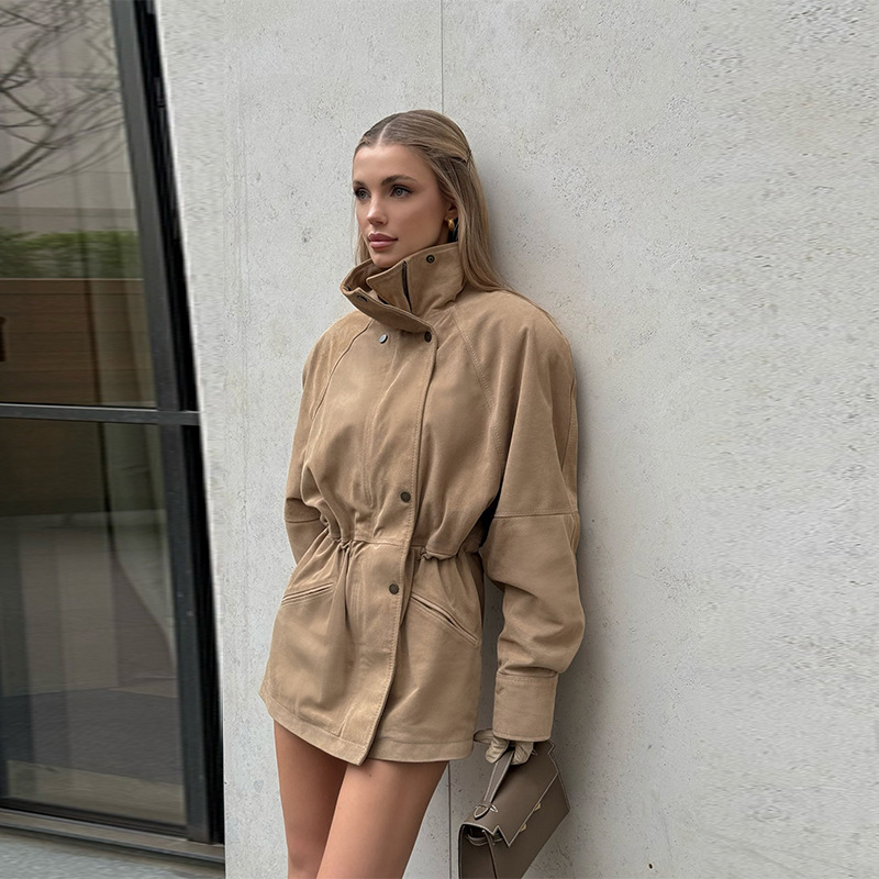 欧美跨境2025秋季新款复古高级风立领收腰显瘦中长款夹克外套