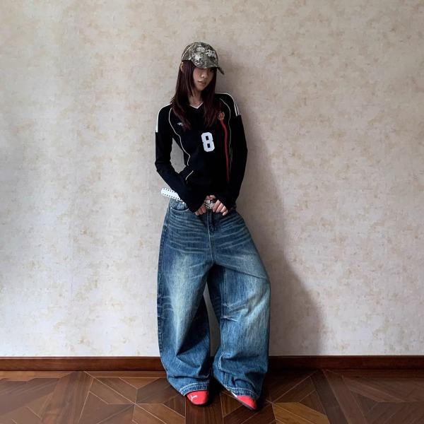 水洗做旧猫须阔腿弯刀牛仔裤男女宽松美式设计垂感解构松弛感裤子