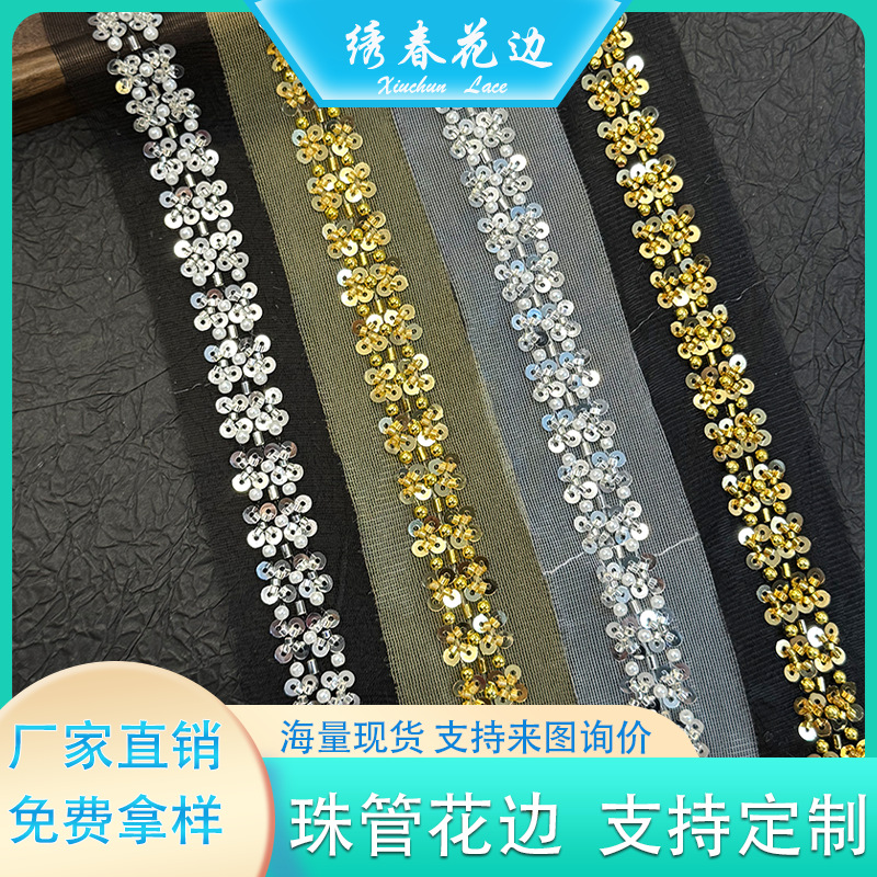 现货网纱底珍珠织带金色银色黑白色珠片服饰辅料花边小香风面料