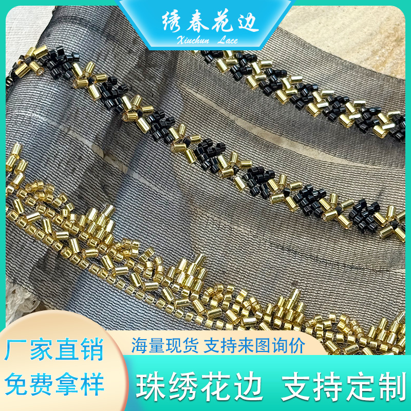 网纱钉珠花边黑白金色DIY手工服装辅料衣领米珠装饰材料珍珠花边