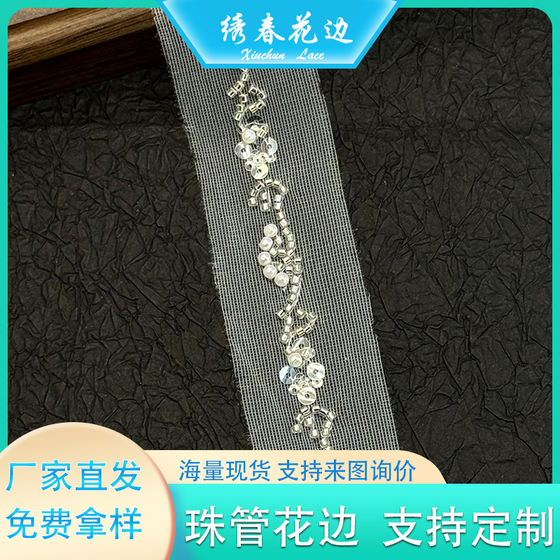 白色钉珠网纱花边 婚纱礼服家纺DIY辅料 珠管珍珠花边带 刺绣条码