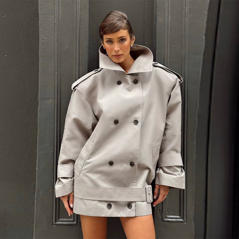 跨境速卖通爆款2025秋季女装时尚气质立领收腰系带短款风衣外套