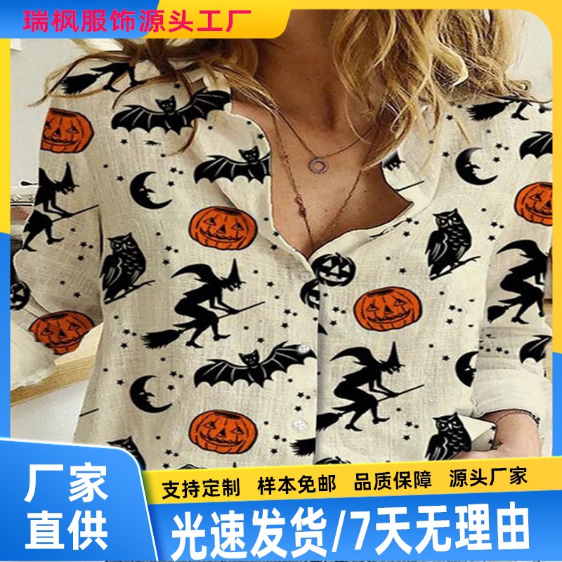 跨境外贸新款女士衬衫女巫搞怪南瓜3D印花万圣节女装 厂家代发