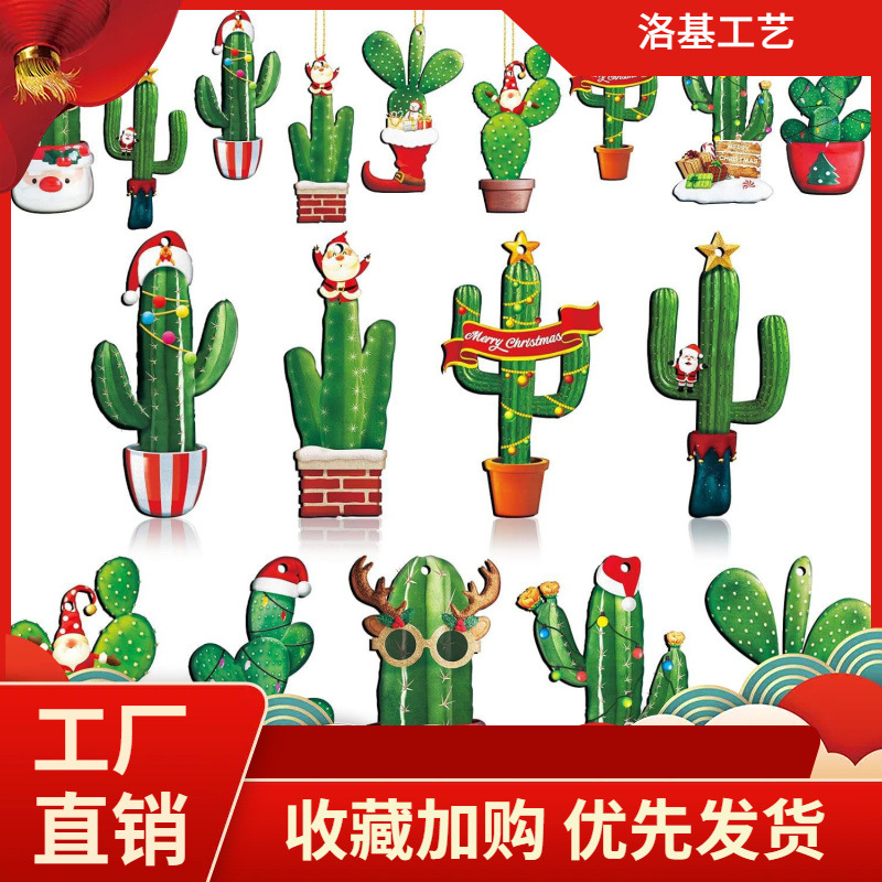 27件圣诞树装饰品仙人掌带圣诞老人帽木制挂饰仙人掌盆木制装饰品