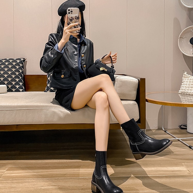 复古圆头粗跟瘦瘦短靴子女2024秋冬新款水洗缩纹后拉链厚底马丁靴
