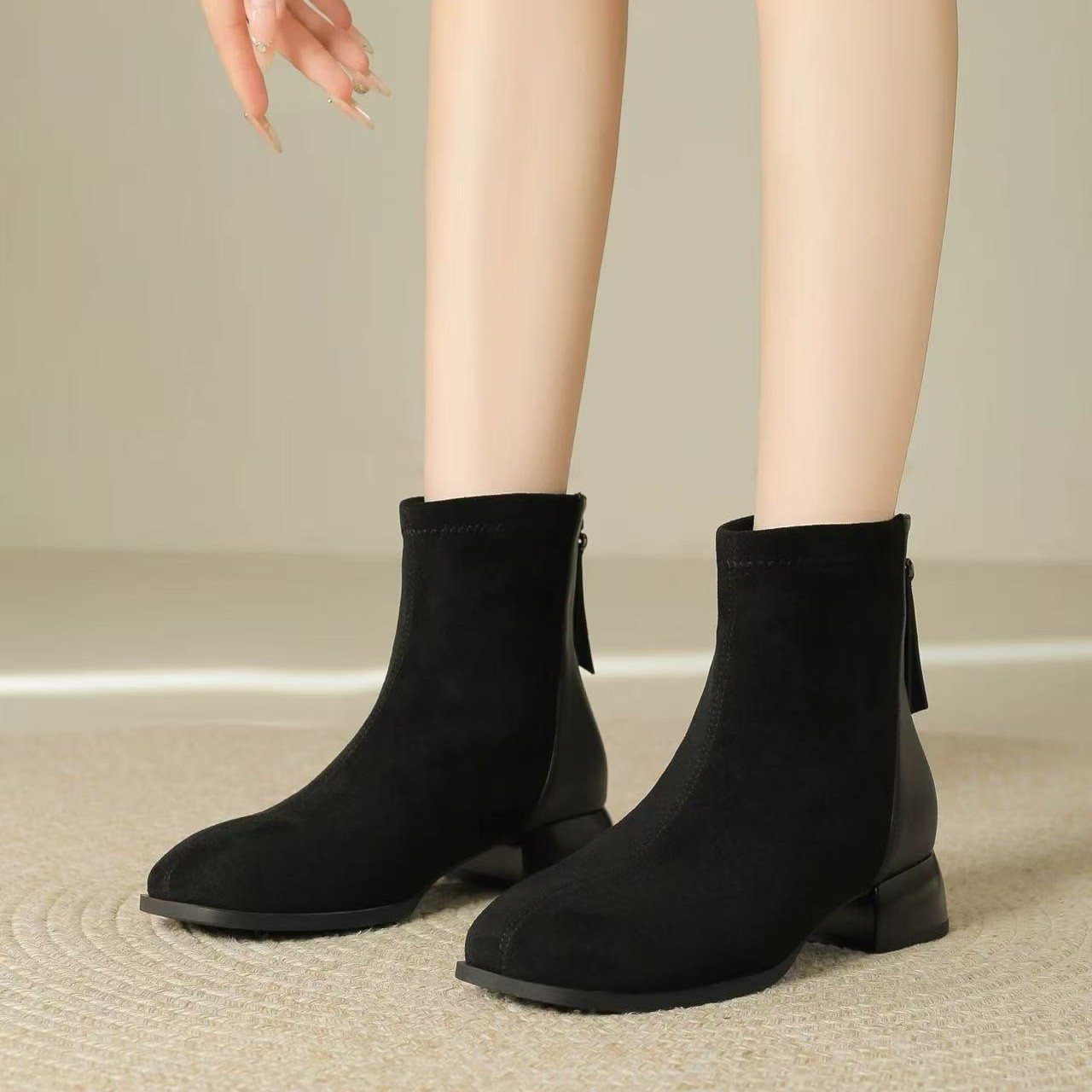 绒面低跟时装靴女2025新款粗跟美拉德靴子法式气质黑色短靴