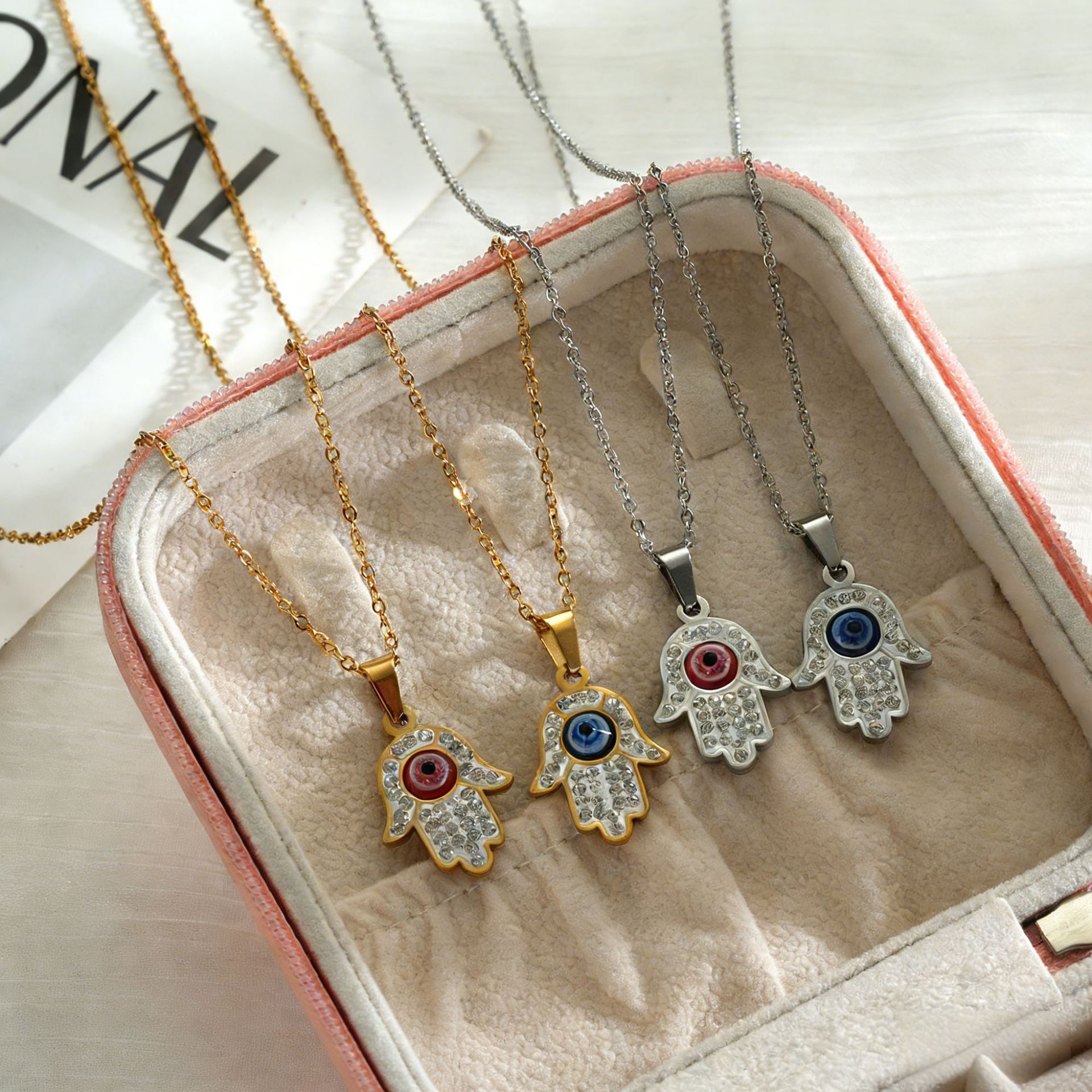 土耳其伊斯兰不锈钢恶魔之眼项链钛钢民族风镶钻蓝眼睛手掌吊坠