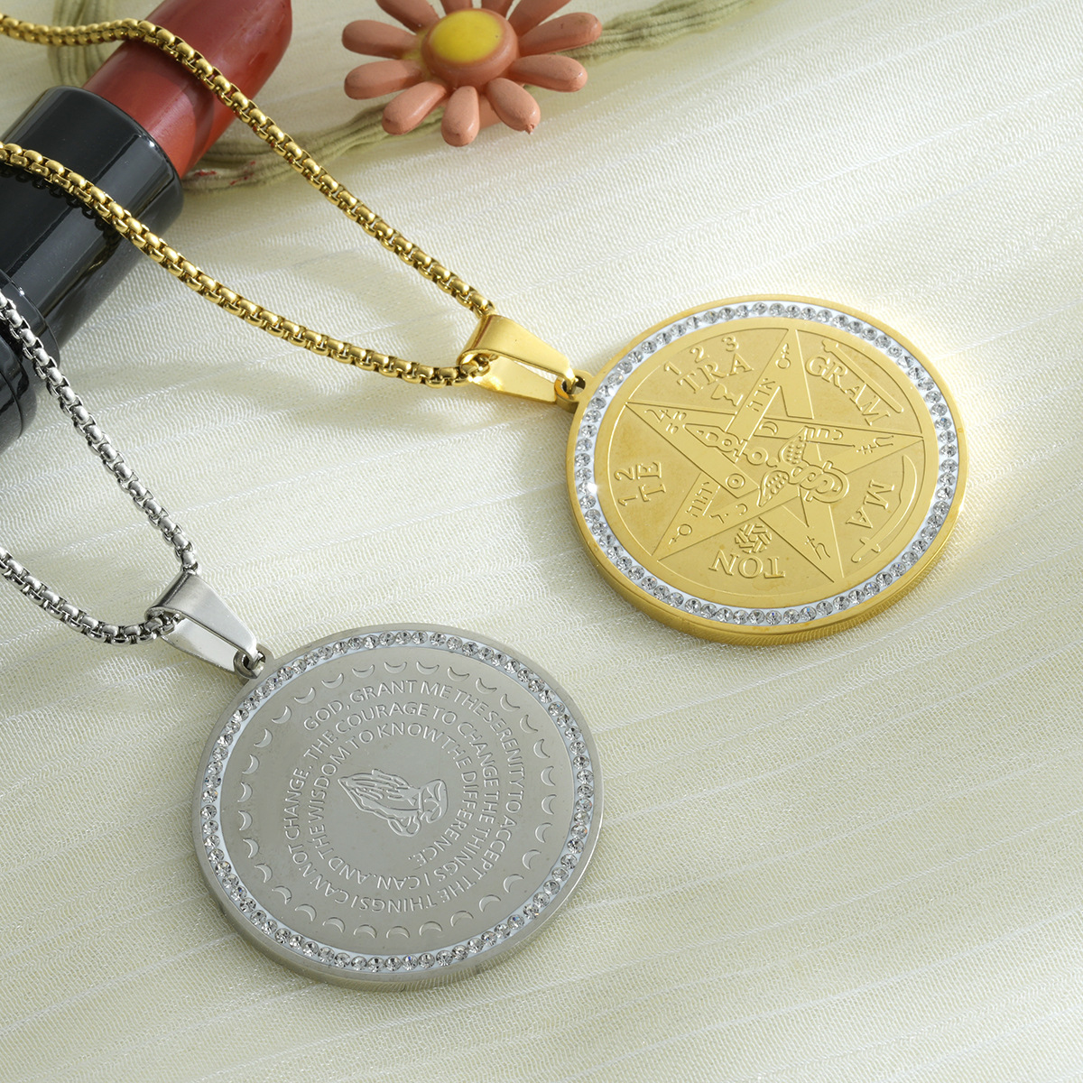 跨境Temu男士不锈钢五角星护身项链镶钻圆形吊坠中性风复古毛衣链