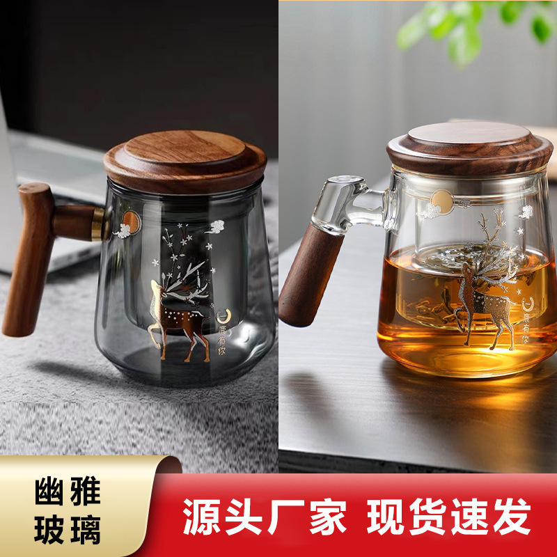 批发木把杯高硼硅三件杯一路有你翘把泡茶杯带盖花茶杯家用办公杯