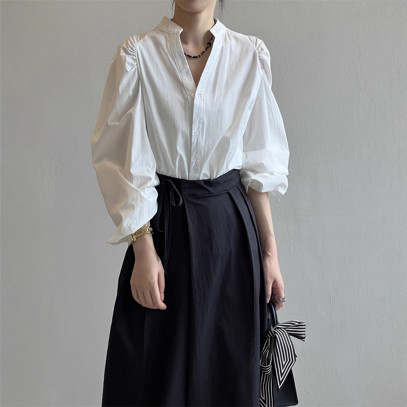 法式气质立领长袖衬衫女2025春秋新款褶皱泡泡袖娃娃衫chic风上衣