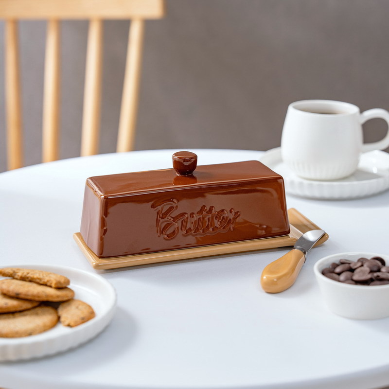跨境原创新品美拉德牛油碟陶瓷黄油盒 奶酪储藏餐厅家用带盖配刀