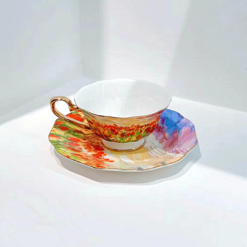 油画郁金香珐琅彩高骨瓷花边咖啡杯碟法式轻奢陶瓷杯碟英式下午茶