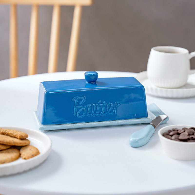 跨境原创蓝色色釉双色黄油盒陶瓷黄油碟 餐厅家用配刀奶酪牛油盒