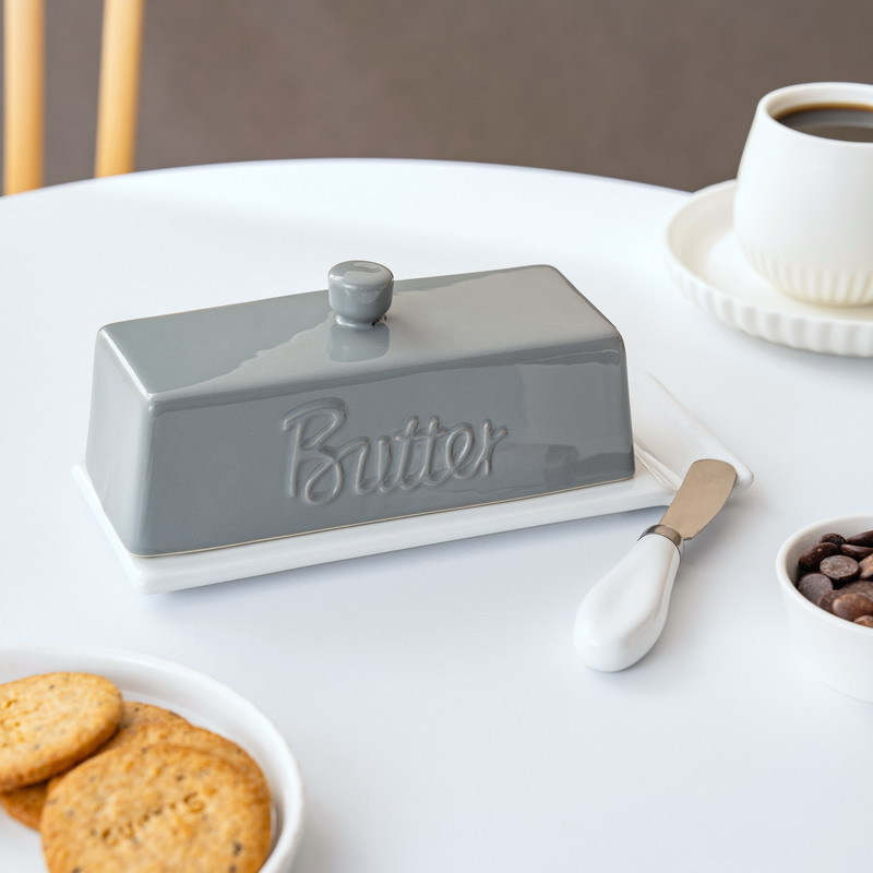 跨境新品灰白色釉牛油碟陶瓷黄油盒 奶酪储存餐厅家用牛油盒配刀