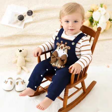 跨境婴儿萌系套装 条纹长袖包屁衣+藏青带扣背带裤长颈鹿装饰套装