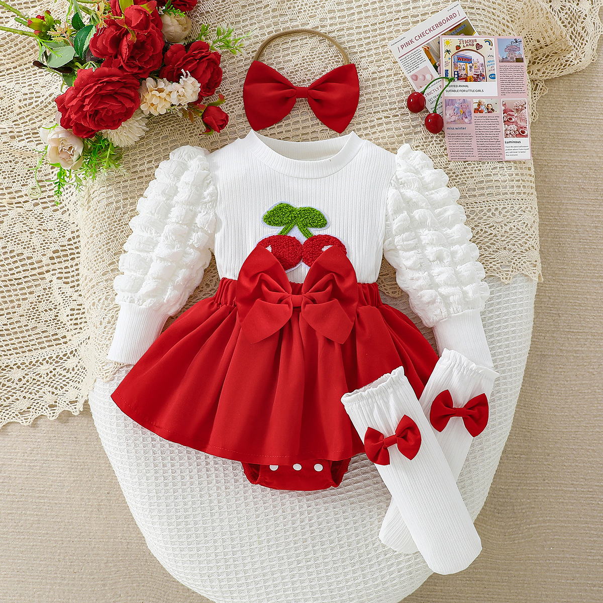 跨境女婴樱桃三件套 撞色樱桃刺绣+立体大蝴蝶结裙+发带袜套组合