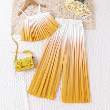 韩系女童渐变色百褶吊带上衣+阔腿裤套装 夏季时髦海边度假套装