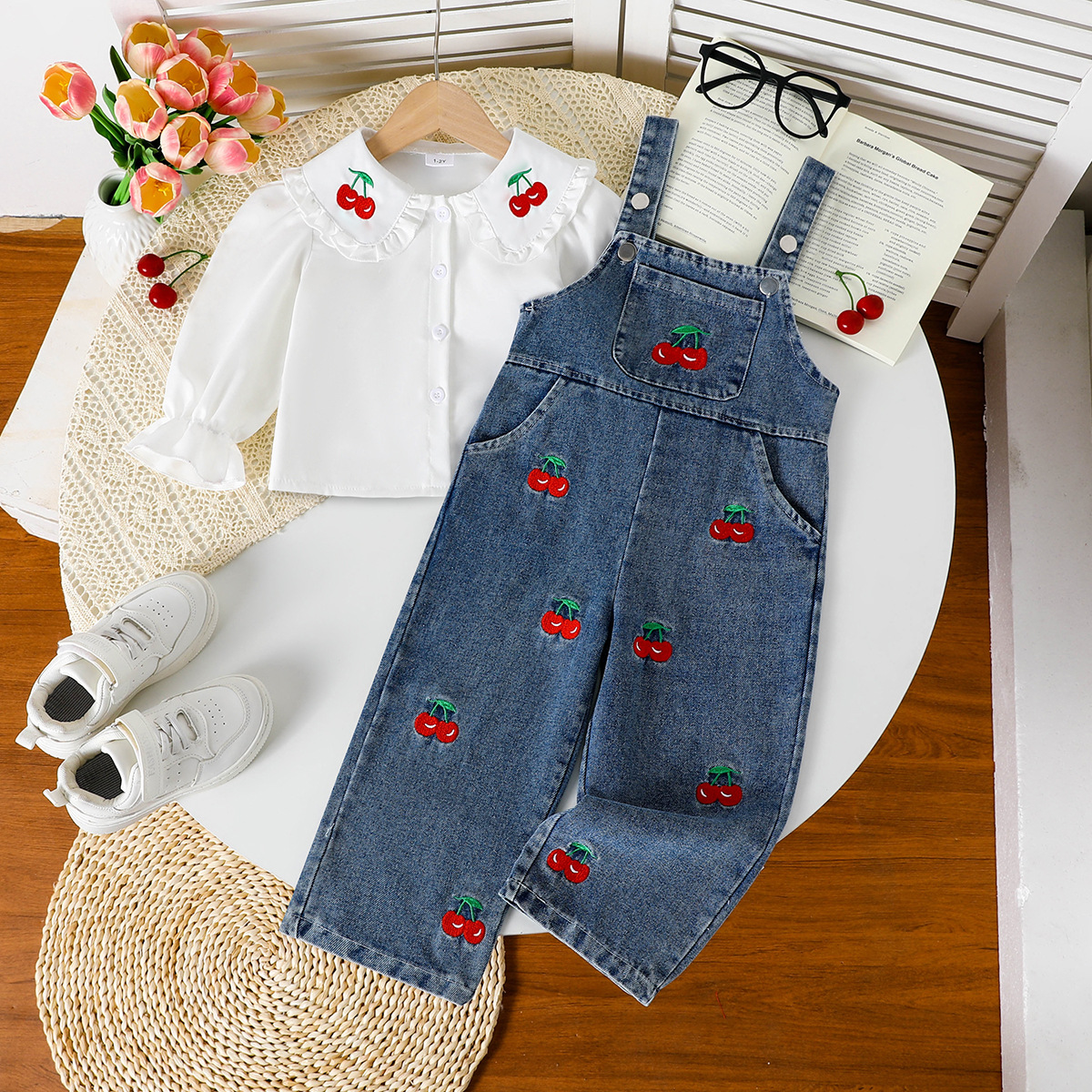 跨境女童可爱娃娃领衬衫+樱桃刺绣口袋装饰背带裤套装
