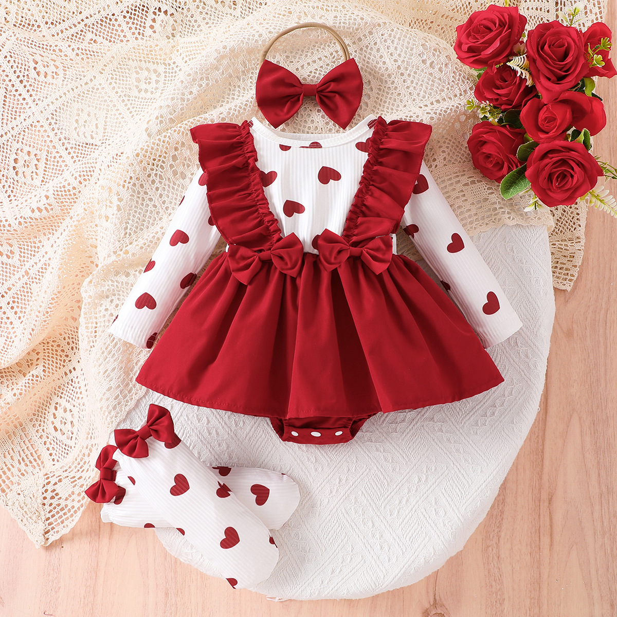 女婴泡泡袖爱心刺绣蝴蝶结装饰哈衣裙加蝴蝶结头饰加袜子三件套