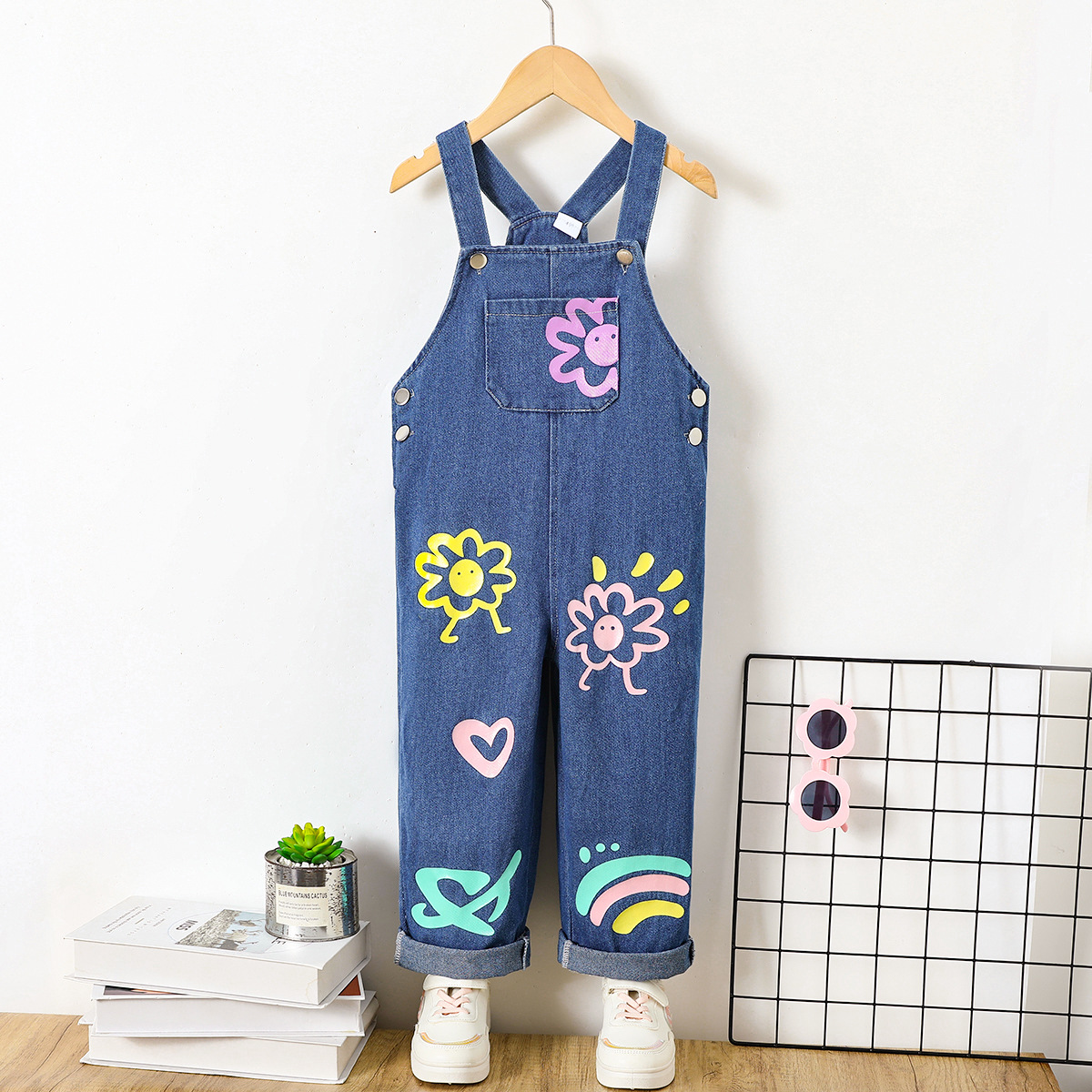 跨境新款女童夏季卡通涂鸦牛仔背带裤 儿童宽松连体裤洋气童装
