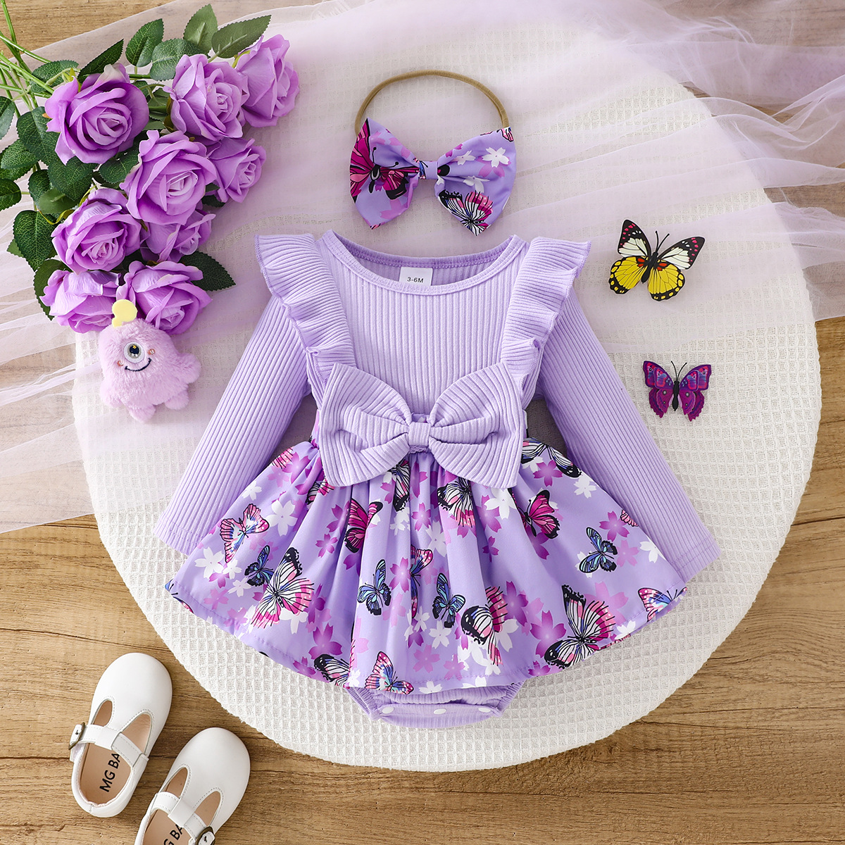 跨境女婴时尚可爱荷叶边蝴蝶结印花装饰长袖哈衣加蝴蝶结发带