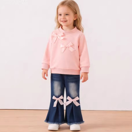 跨境INS新款女童洋气两件套 粉色蝴蝶结卫衣+牛仔微喇裤小童套装