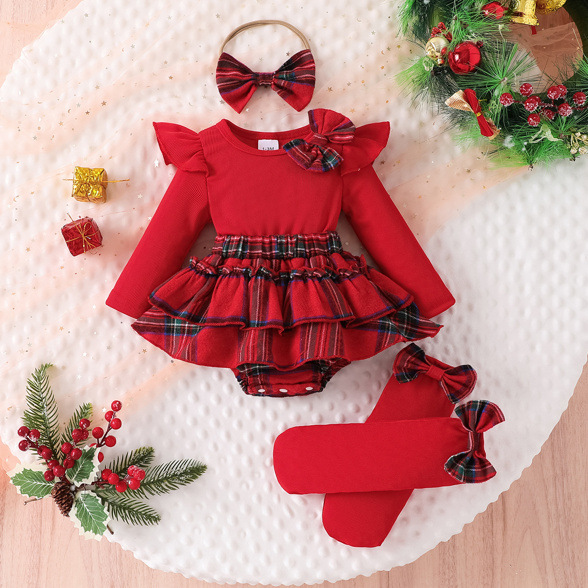 女宝宝可爱小飞袖长袖格纹裙摆哈衣+袜子+头饰三件套