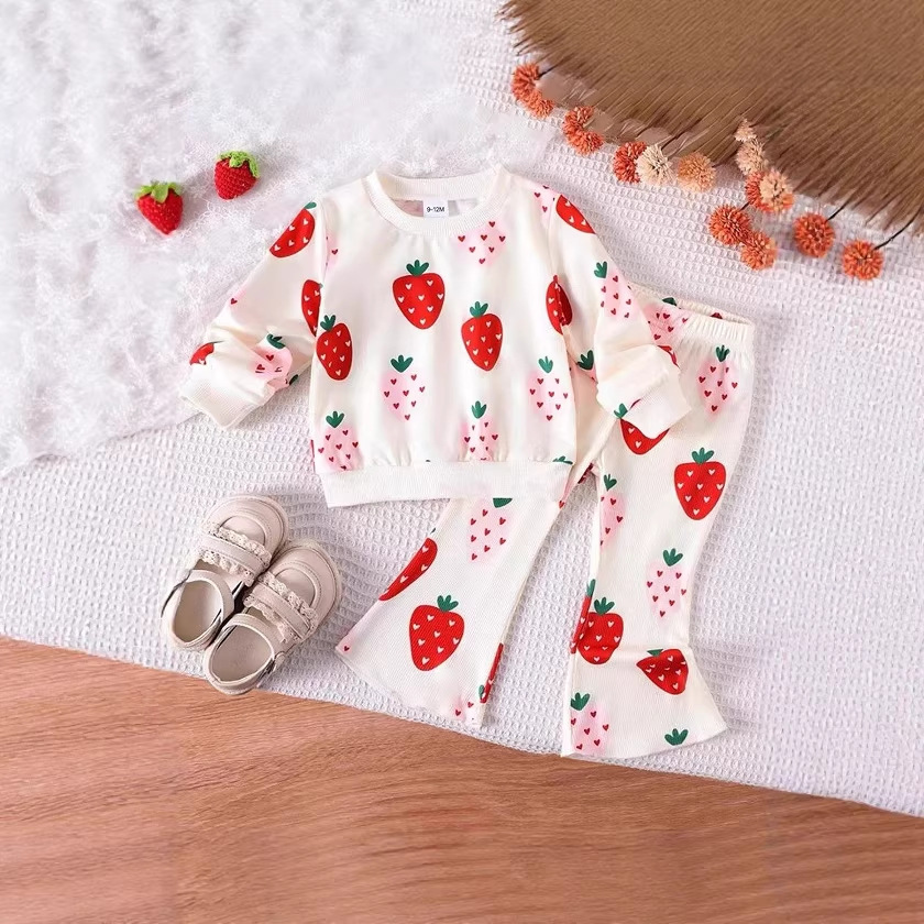 韩版女童草莓印花套装 长袖圆领上衣 + 喇叭裤 萌娃外出服两件套