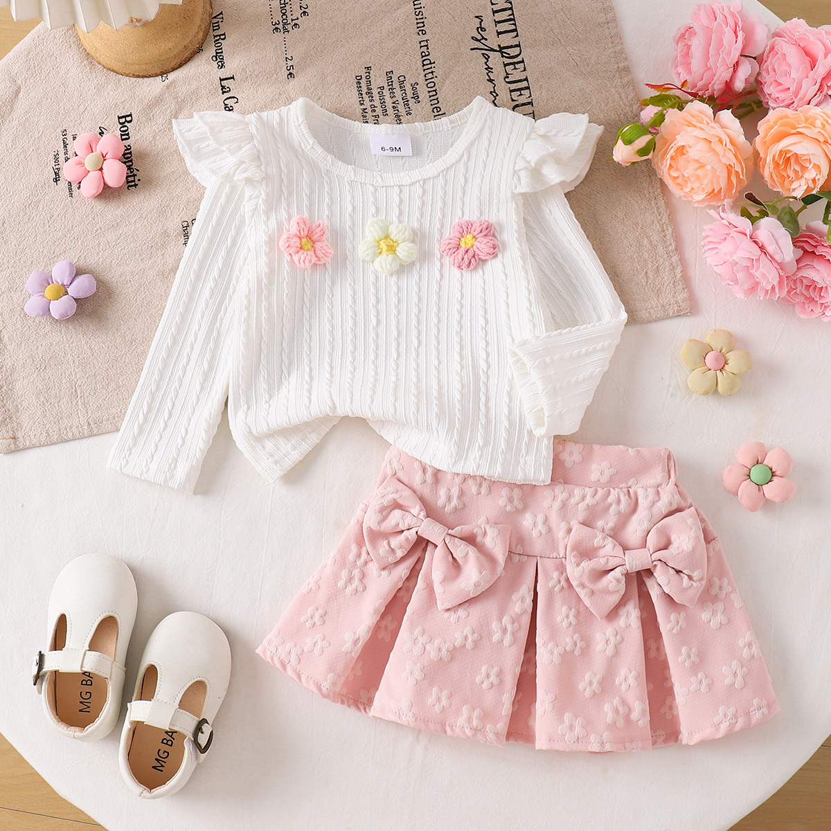 跨境女童甜美小花套装 宝宝长袖飞袖上衣 + 粉色蝴蝶结短裙
