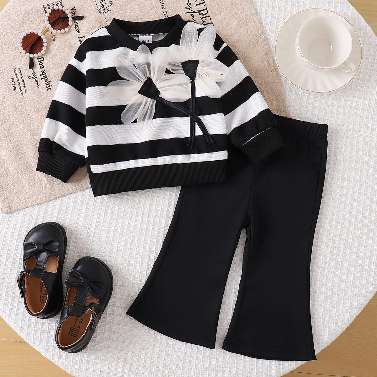 跨境女宝甜美套装 立体花朵装饰卫衣 + 弹力喇叭裤两件套