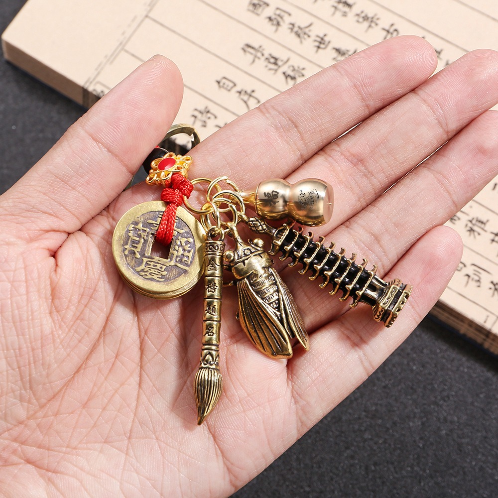 五帝钱钥匙扣挂件黄铜葫芦金榜题名文昌笔复古风九层塔文昌塔挂坠
