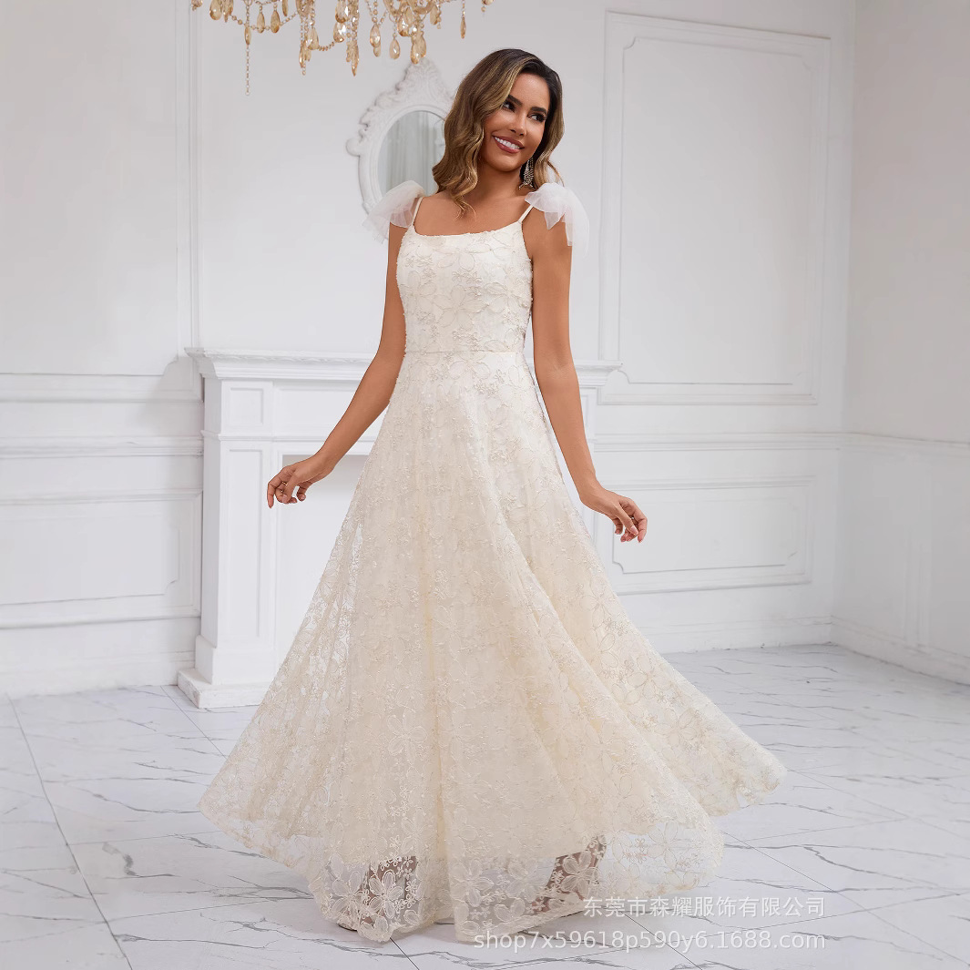 吊带长款连衣裙 蕾丝镂空蝴蝶长裙 亚马逊长裙 遮肚子裙子 新款