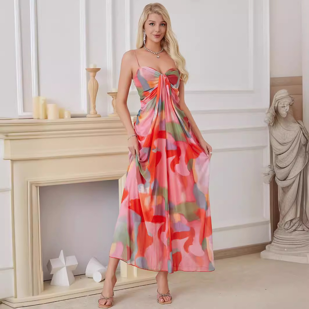 2024夏季新款吊带款渐变印花性感连衣裙修身轻熟显瘦