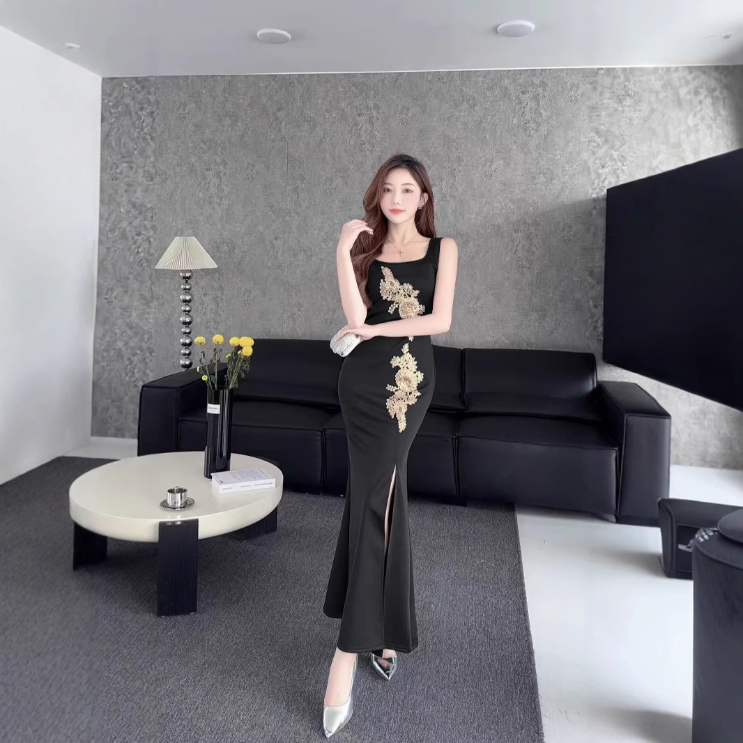 新款晚礼服宴会优雅名媛气质方领无袖连衣裙刺绣修身包臀开叉长裙