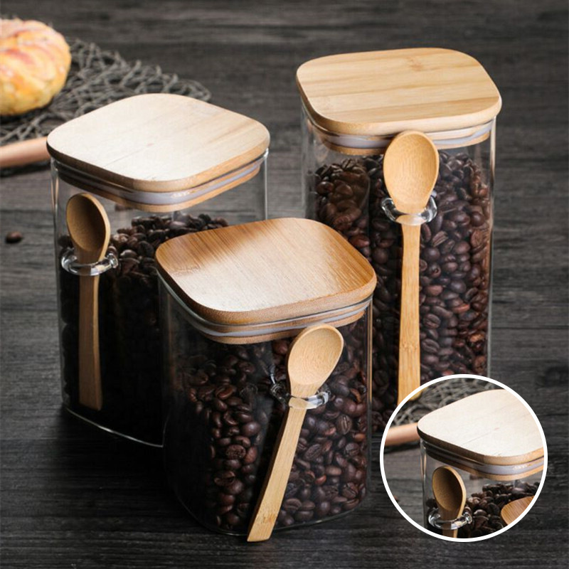 方形密封罐带勺玻璃储物罐茶叶罐五谷杂粮罐带勺方罐玻璃密封罐