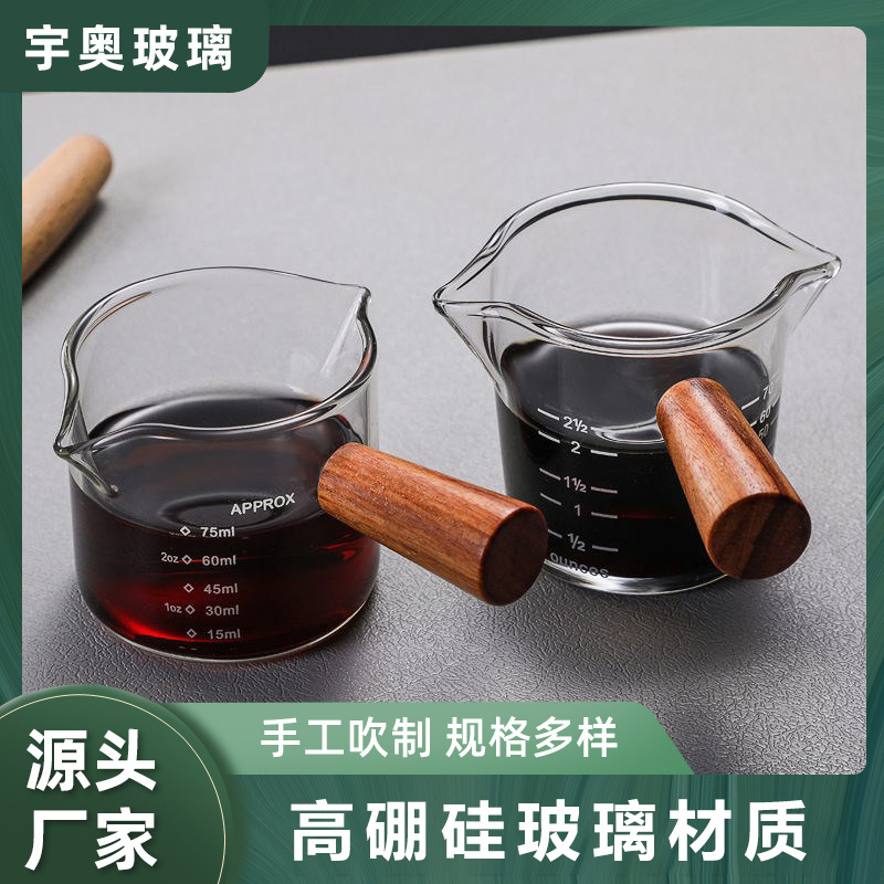 现货高硼硅小奶蛊家用带刻度蛊司杯木把双嘴奶蛊杯玻璃量杯