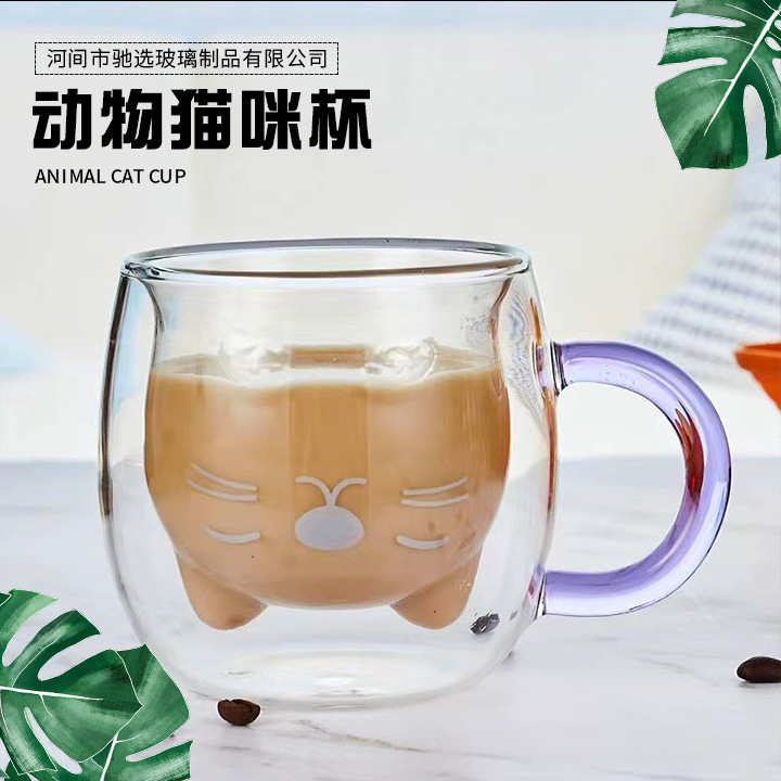 厂家批发卡通玻璃杯动物猫咪杯带把双层杯立体咖啡杯果汁杯马克杯