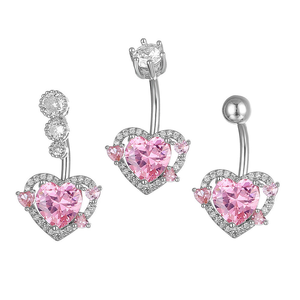 欧美跨境产品亚马逊穿刺饰品心形镶锆石肚脐环粉色爱心肚脐钉心型