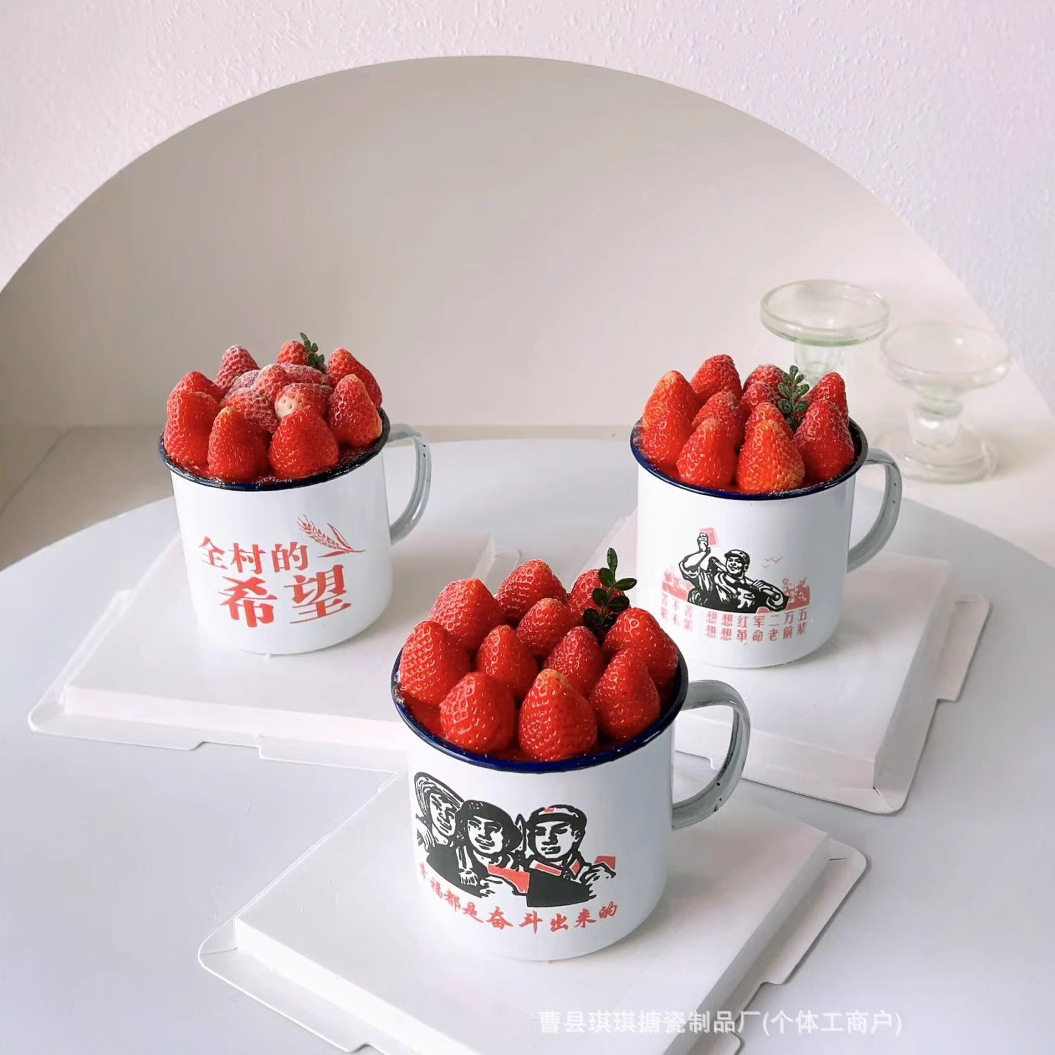 网红草莓搪瓷蛋糕杯复古怀旧茶缸茶杯圣诞节蛋糕装饰插件搪瓷杯马