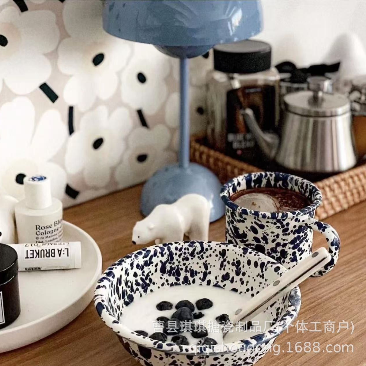 早餐好看盘子餐具搪瓷麦片海军蓝风咖啡酸奶ins燕麦片咖啡杯泼墨