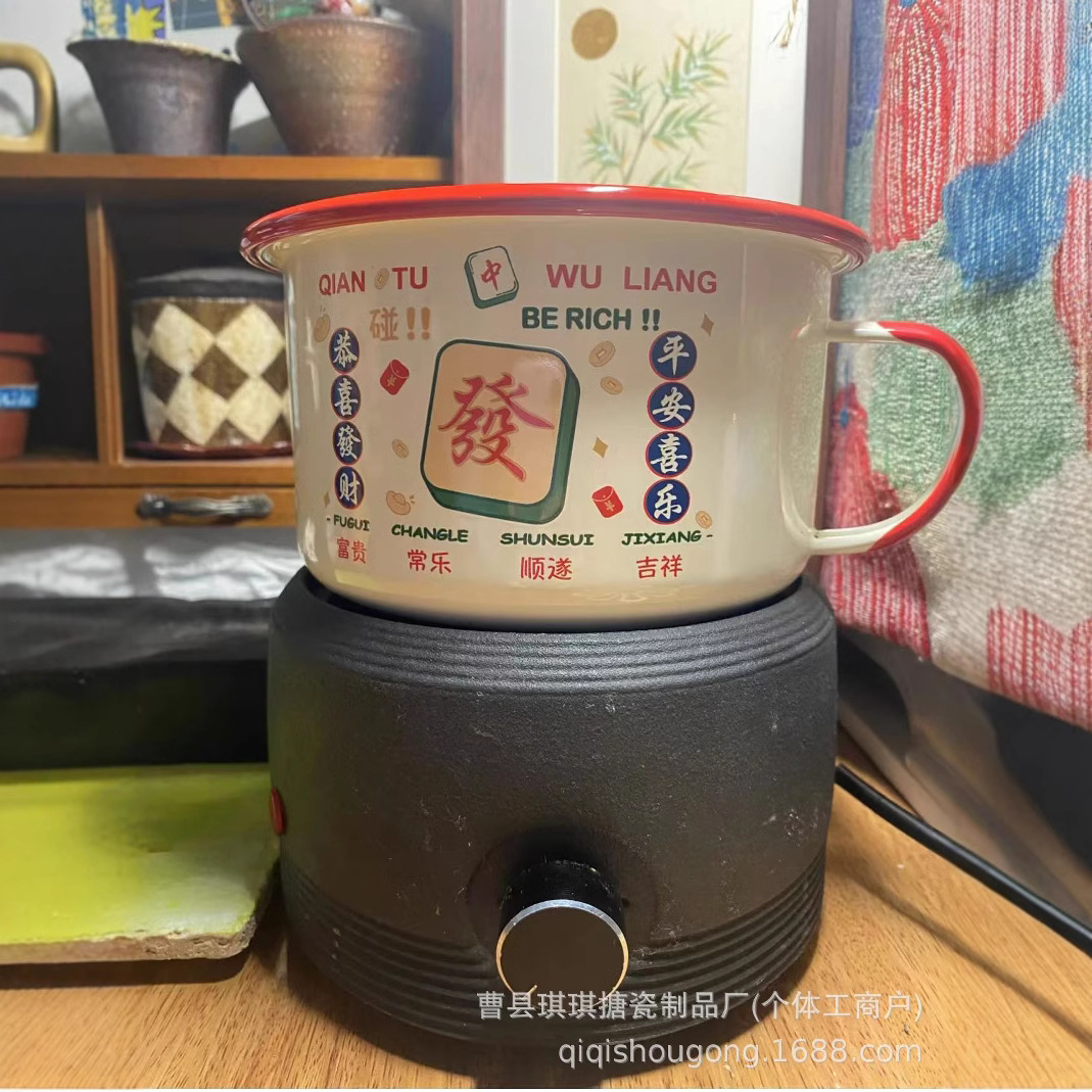 出口发财致富搪瓷杯复古港风怀旧茶缸子加厚国潮马克杯带盖伴手礼
