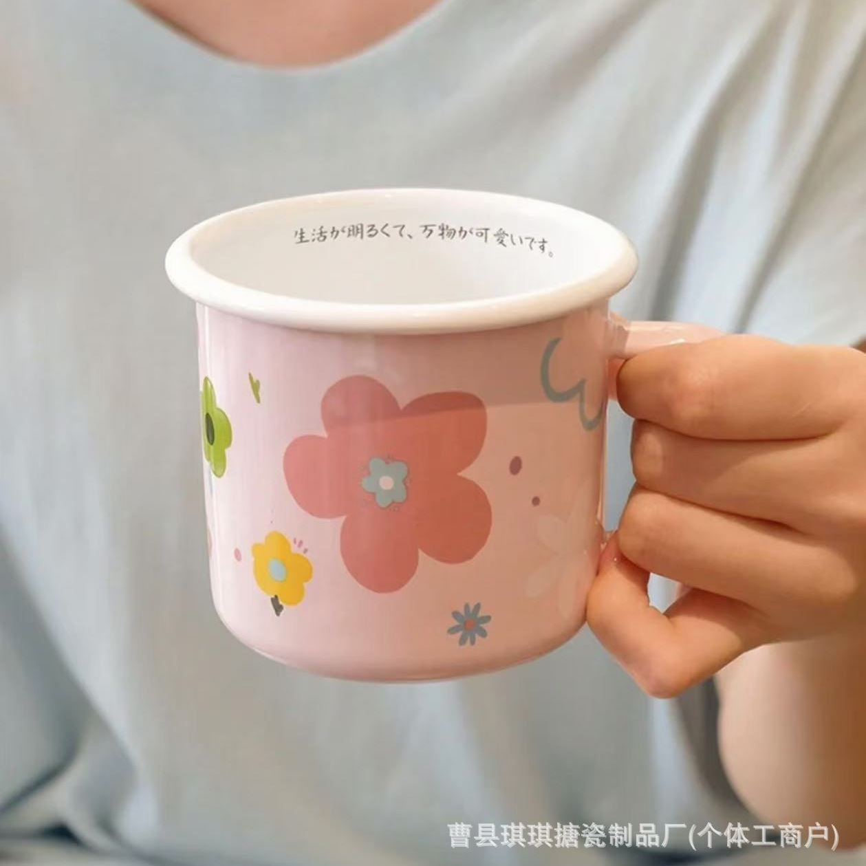 加厚05卷边搪瓷杯彩色卡通马克杯粉色花朵搪瓷杯加印logo咖啡杯